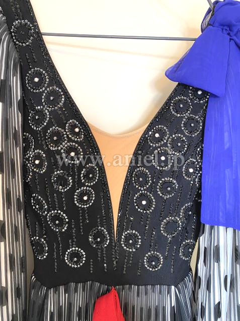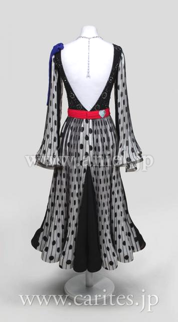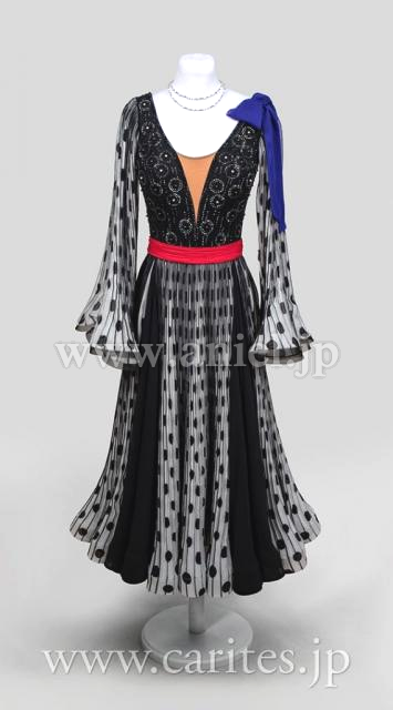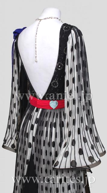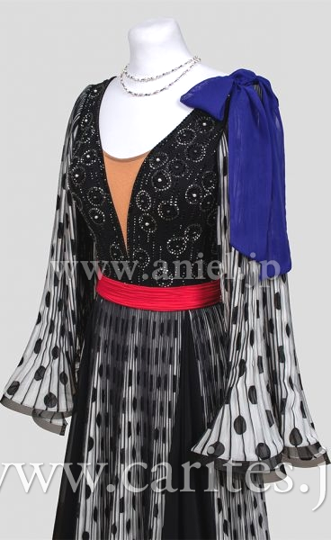 肩にはブルーパープルのリボンデザイン。ウエストのレッドベルトがしっかりとマークします。