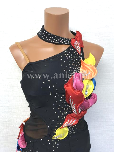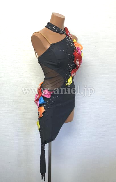 ミニ丈のタイトデザインにカラフルなモチーフが映えるラテンらしい1着。