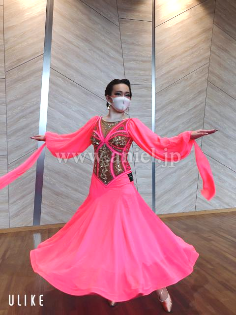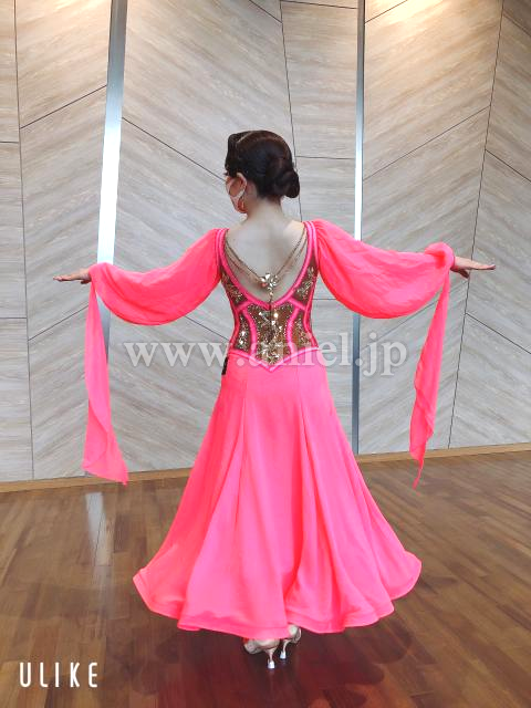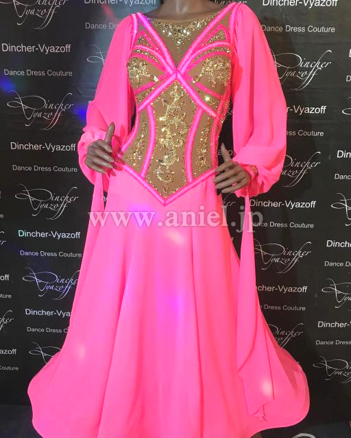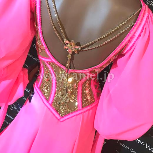 ボディはコルセット風デザインでピンクの蛍光ストーン、ゴールドのストーンが豪華に飾られています。