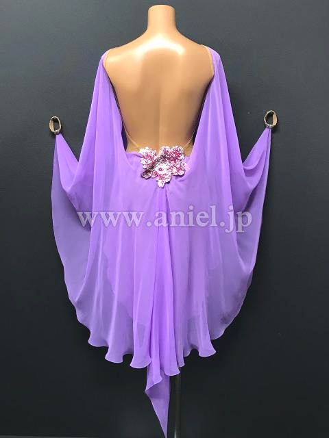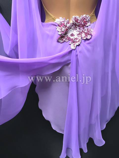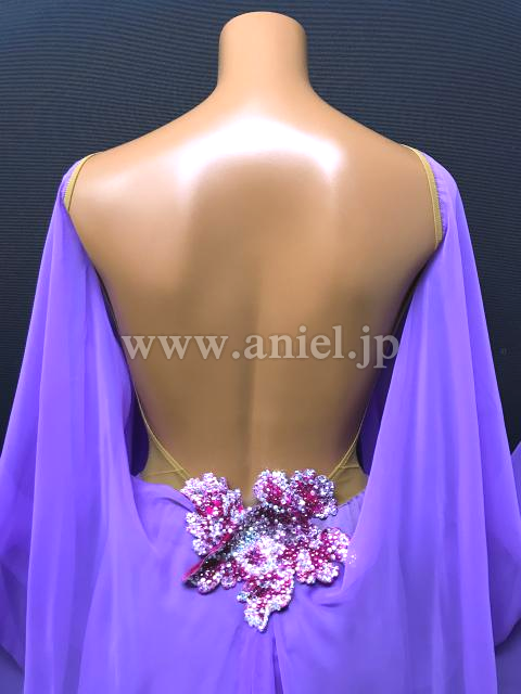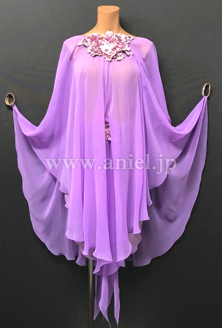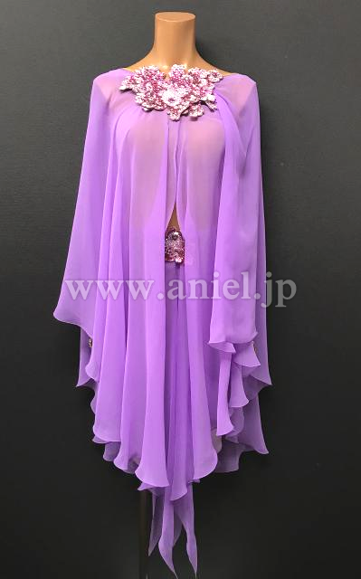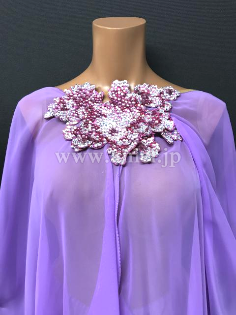 Grand Amourのルンバドレスです。明るめでパステルカラーのライラックドリームが、妖艶さと可愛らしさを演出してくれます。マントのような生地が体全体を多いますが、首元はすっきり、そしてジョーゼットの生地なので全体に透けて見え、ちょうどよく体のラインを隠しながら見せてくれます。胸元、お腹とヒップに同じお花のモチーフが付いておりポイントになっています。腕輪が付いているので、袖がもたつくことはありません。ルンバのデモにぴったり。