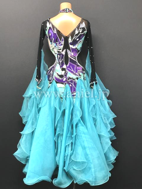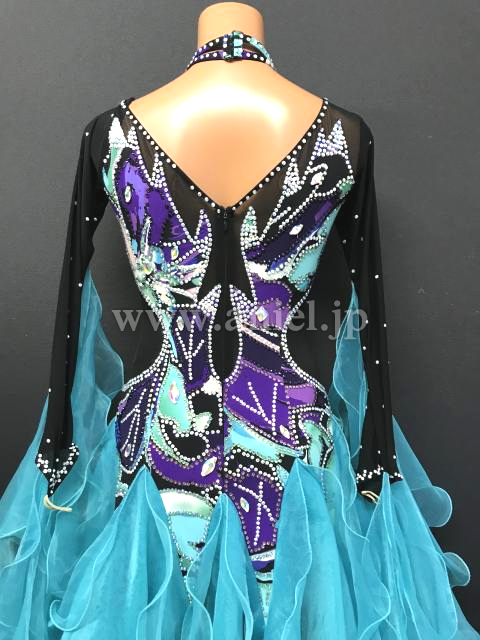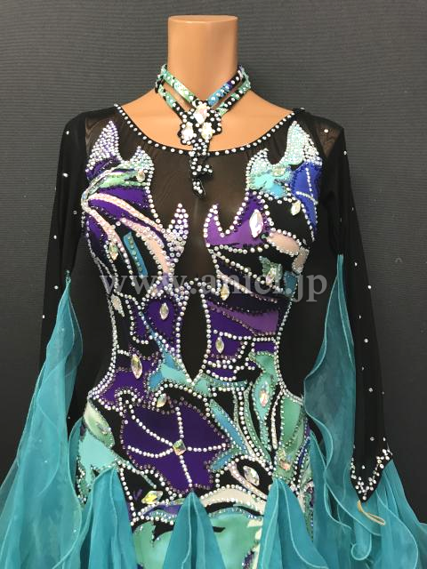 黒のボディに紫や緑のカラーで複雑な模様がいれられたドレスです。