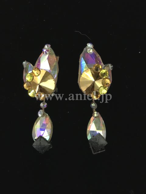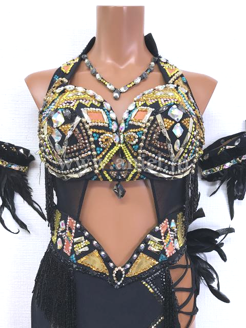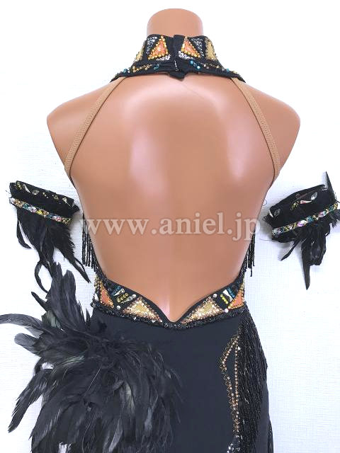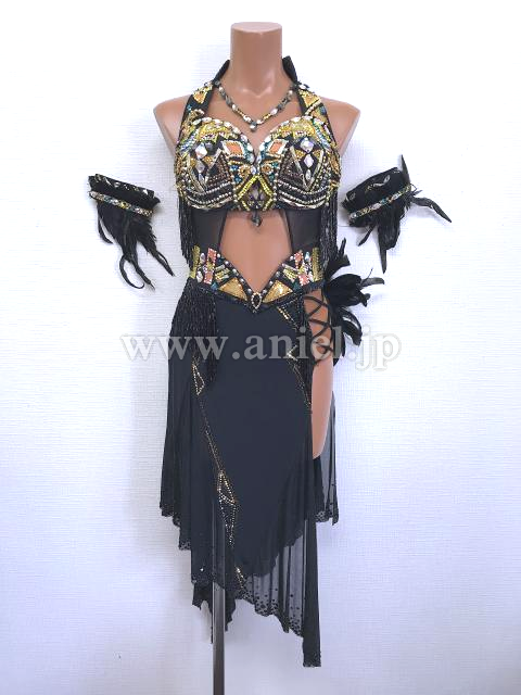 黒のボディにカラフルなストーンの幾何学模様がラテンらしい雰囲気を出すドレスです。