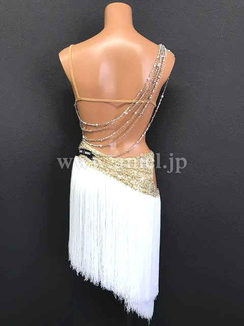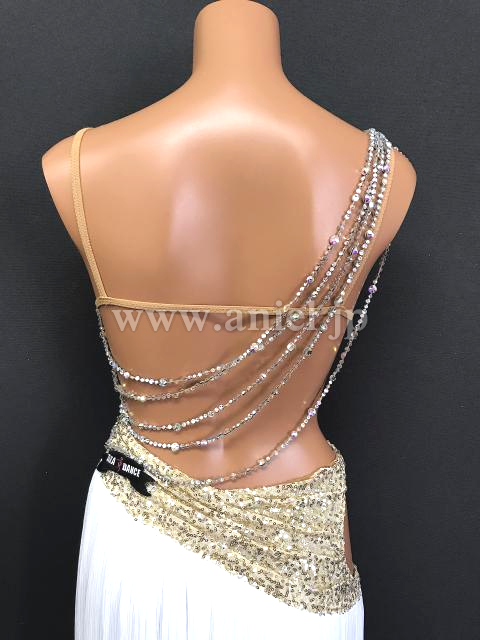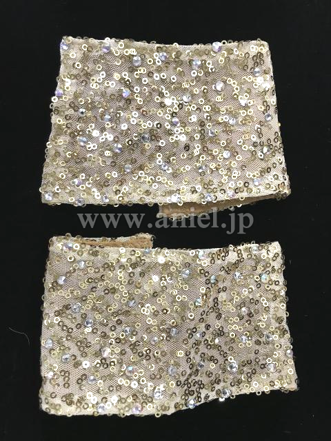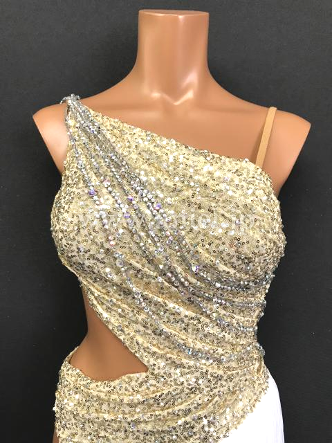 ゴールドのスパンコール生地がドレープで動きを出すドレスです。