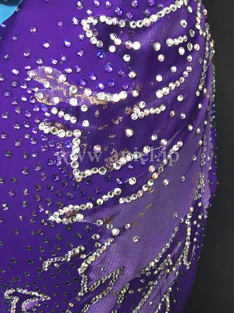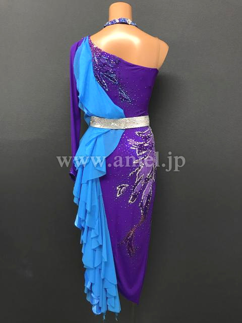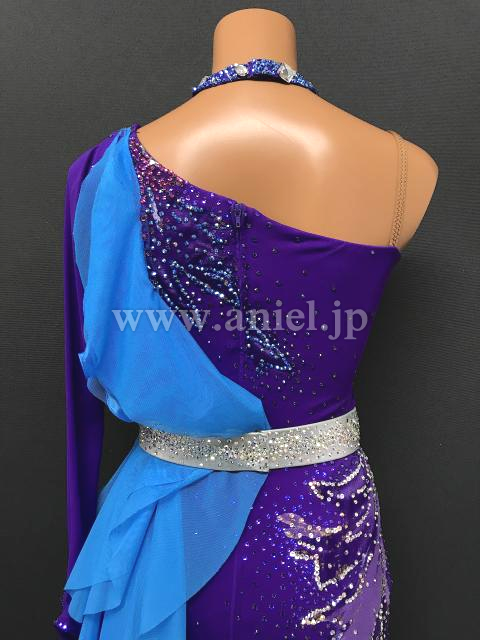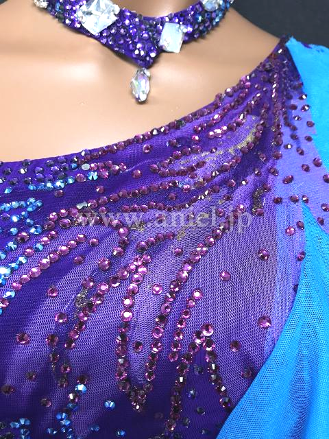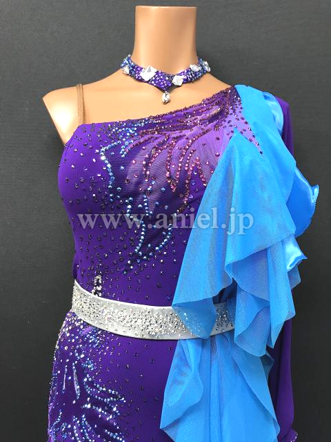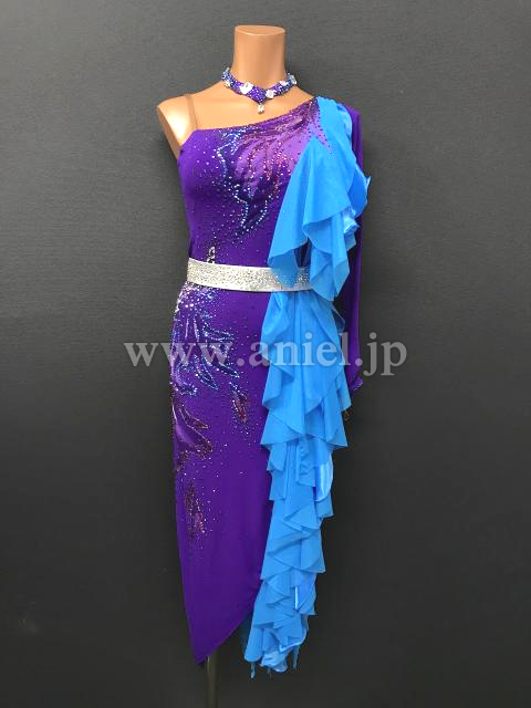 紫のボディに水色のフリルが映えるドレスです。