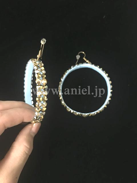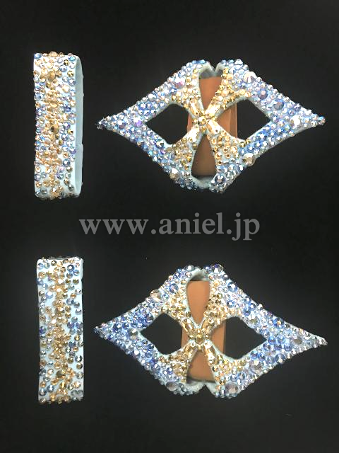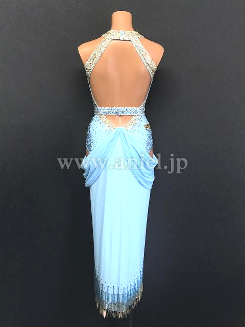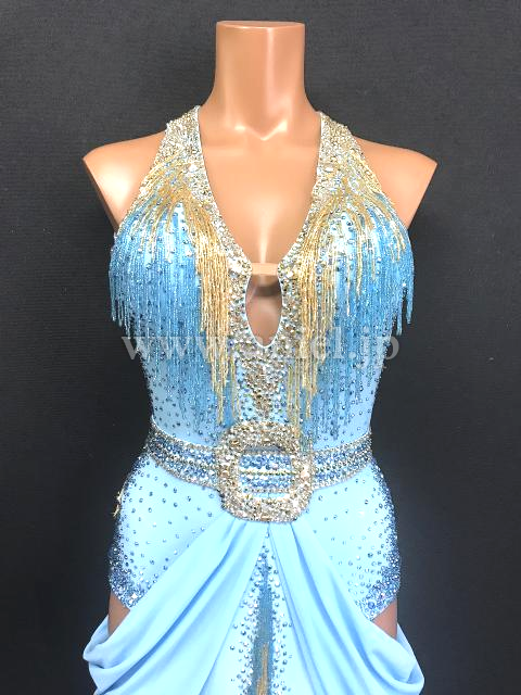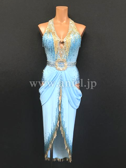 スカートの裾にはゴールドのスパンコールと水色のビーズフリンジ があしらわれています。