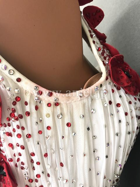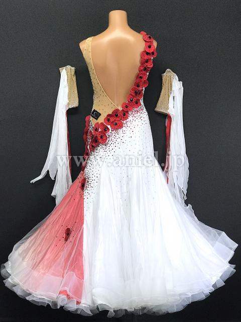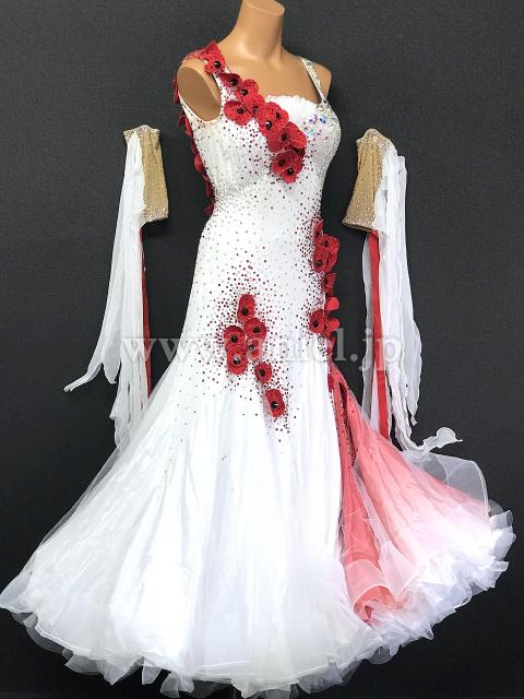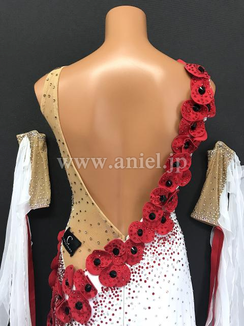 スカートのグラデーションが美しく、白地に赤い小花が流れるように立体的に散りばめられた上品で華やかなドレスです。赤い3Dフラワーの中心に装飾された黒いスワロフスキーが甘くなりすぎず、大人かわいい感じを醸し出しています。3Dフラワー、ボディー共に沢山のクリスタルAB及び赤のスワロフスキーで装飾されています。伸縮性があるため、とても気持ちよく踊れます。スカート・フロートはとても良く踊ります。
