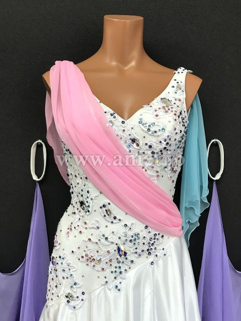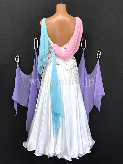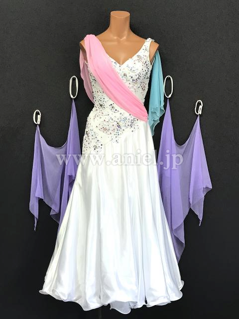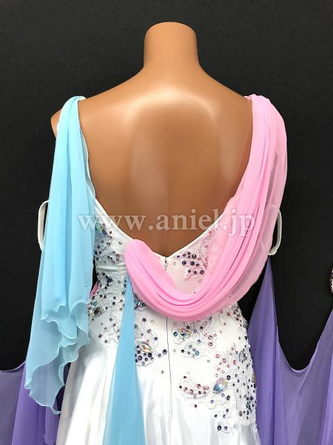 白のボディにピンクや紫の差し色が可愛らしいドレスです。