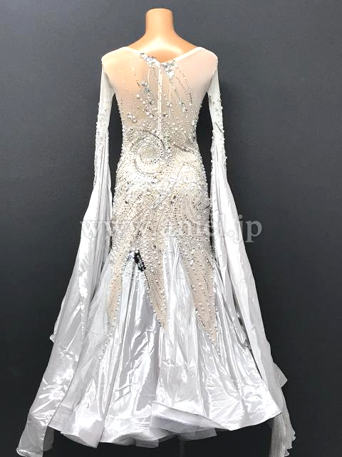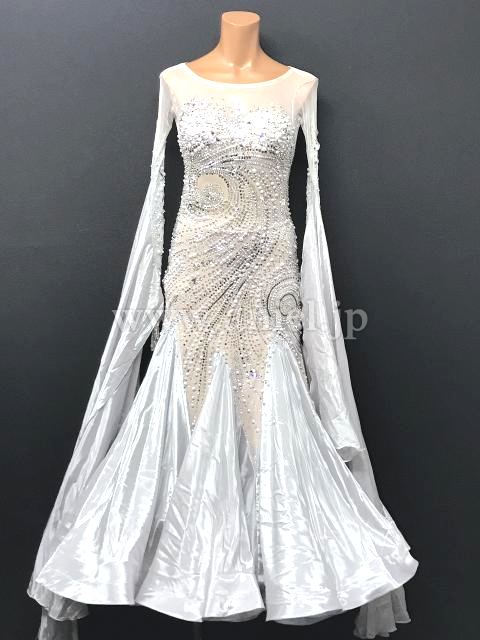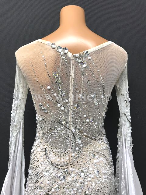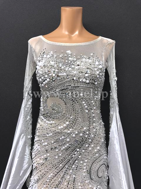 上品なシルバーカラーにたっぷりのストーンが美しく配置されたドレスです。