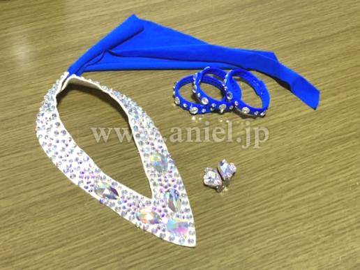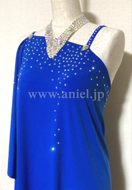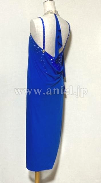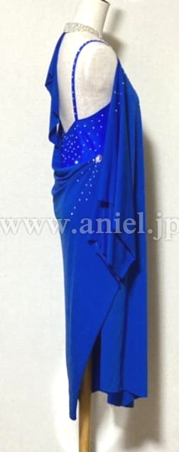 青色のストレッチ生地でランダムなドレープのデザインが良く踊ります。