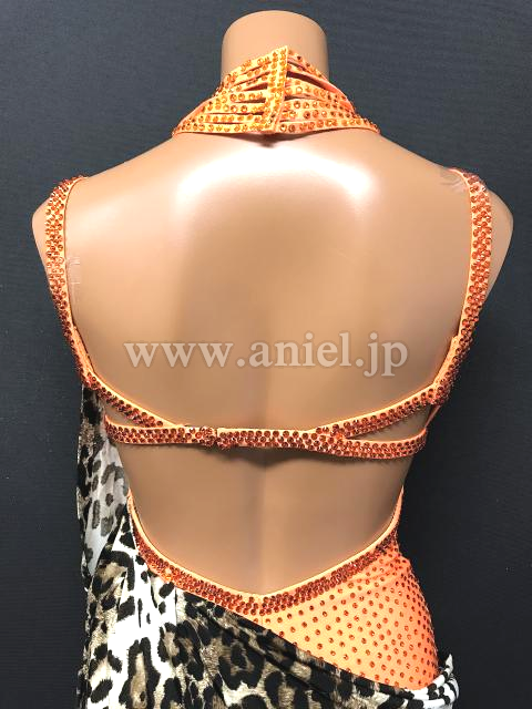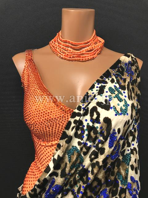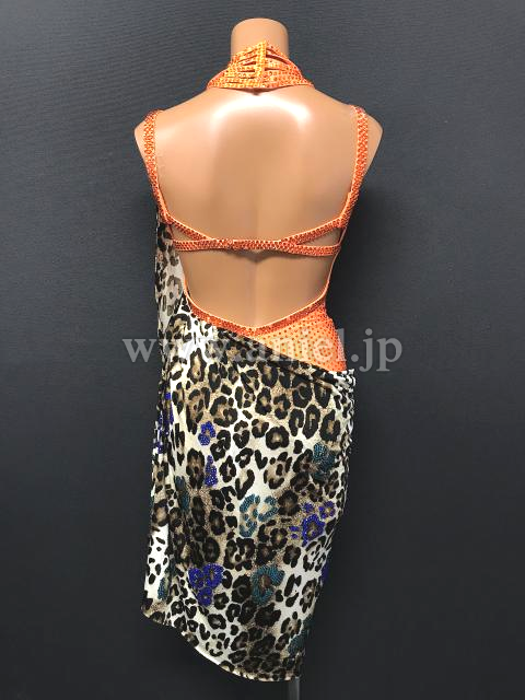 オレンジのボディにヒョウ柄の布がスタイリッシュなドレス。