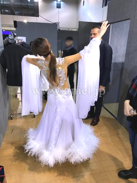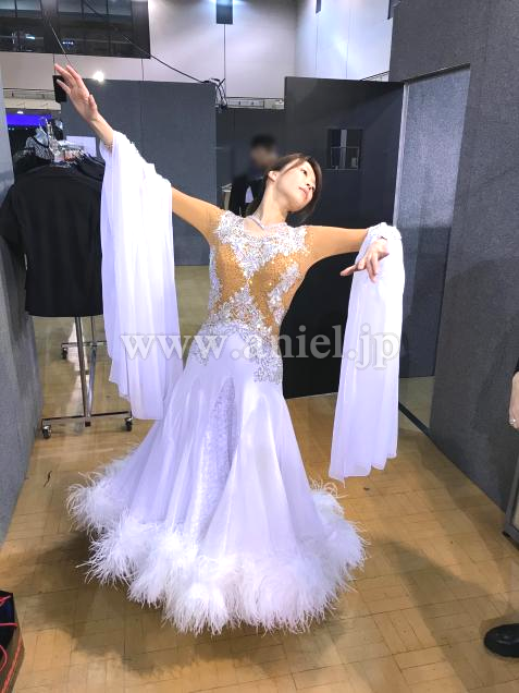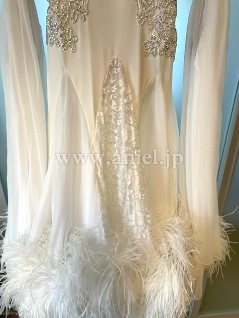 スカートは3枚重ねで、一番下にオーガンジー、真ん中にシフォン、一番上はジョーゼットとレース生地の接ぎで、3枚共に裾にホースヘアが入り、裾に羽根をつけています。