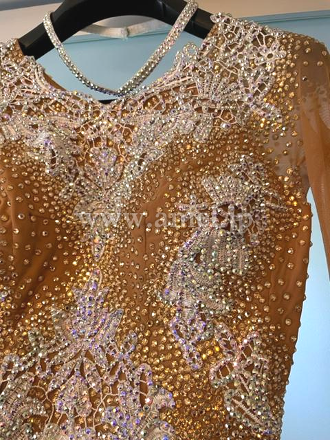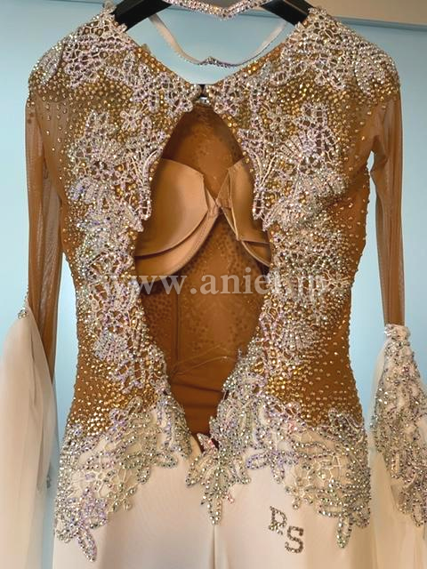 上体はベージュのネットに白のレースモチーフを用い、ネットの上にはゴールド、レースの上にはオーロラの石をちりばめています。