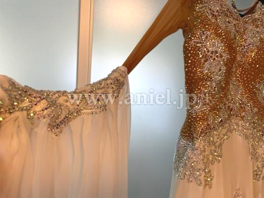 腕は、ベージュのネットが手首まであり、ジョーゼットの大判のフロートが付いていて、上腕部分にレースモチーフとその上にオーロラの石が貼ってあります。