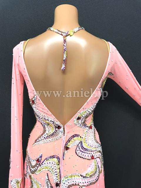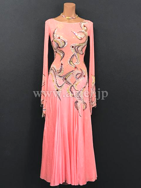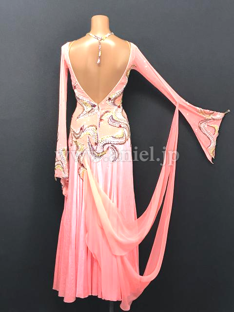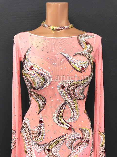 淡いサーモンピンクにレースとカラフルストーンで上品な装飾が施されているどドレスです。