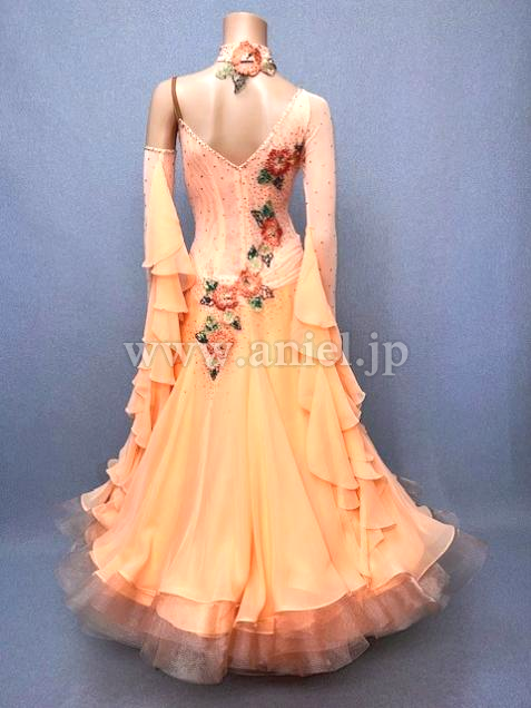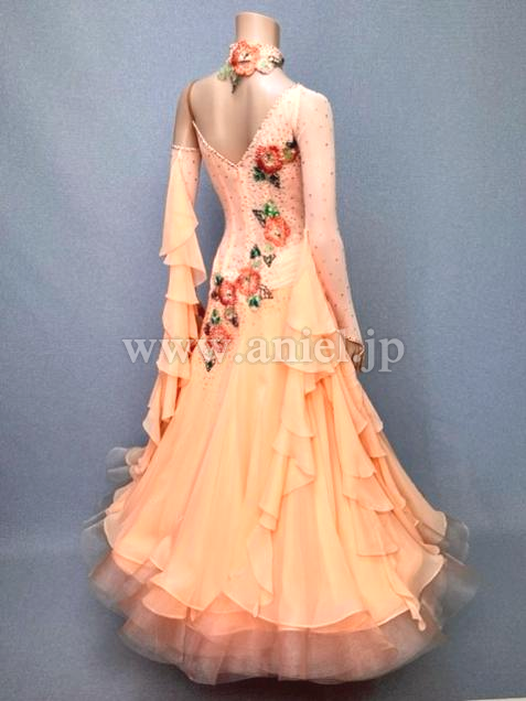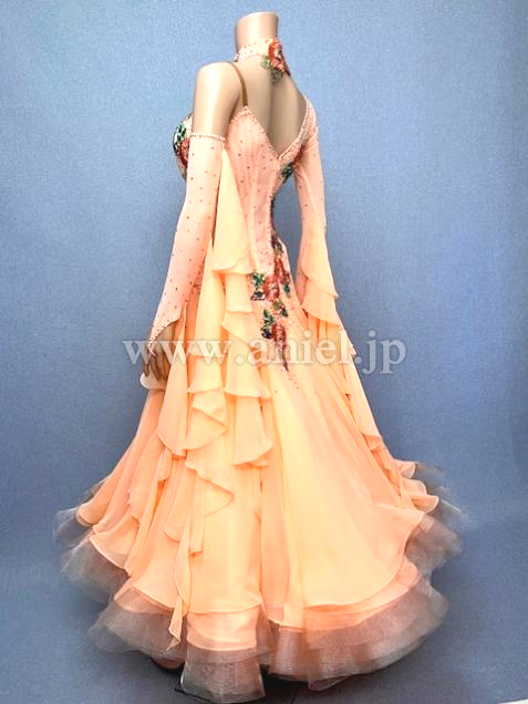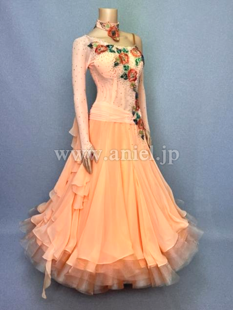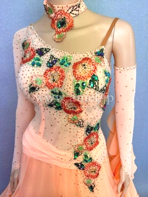 サーモンオレンジ色に刺繡モチーフをリッチに配した、上品でシルエットの綺麗なドレスです。