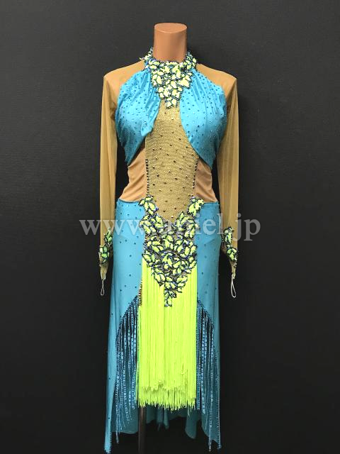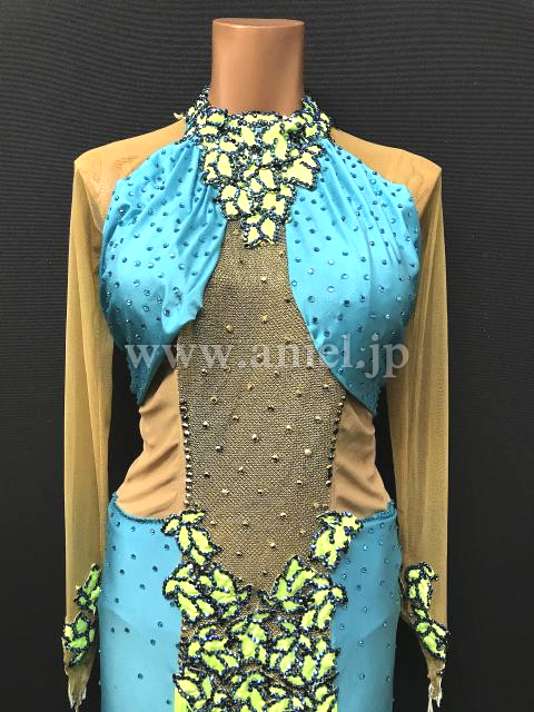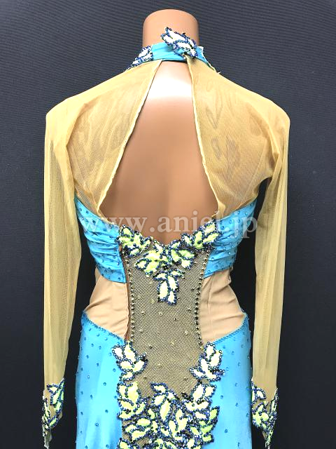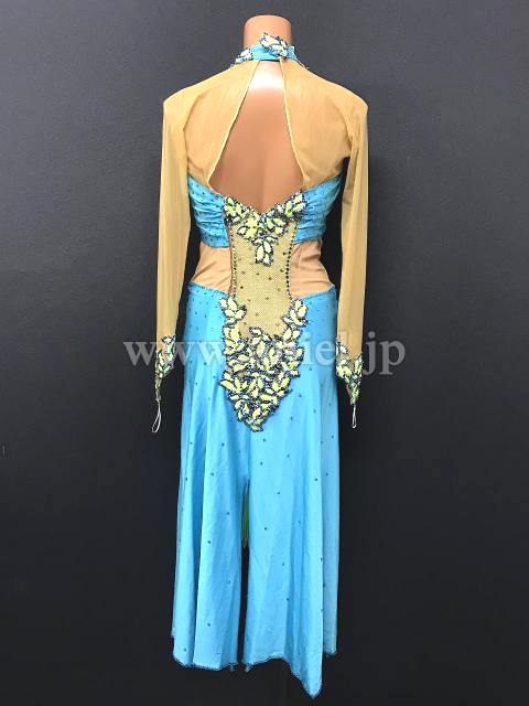 水色に黄緑のモチーフが映えるドレスです。