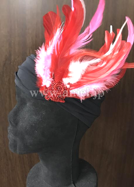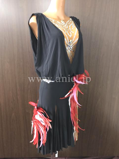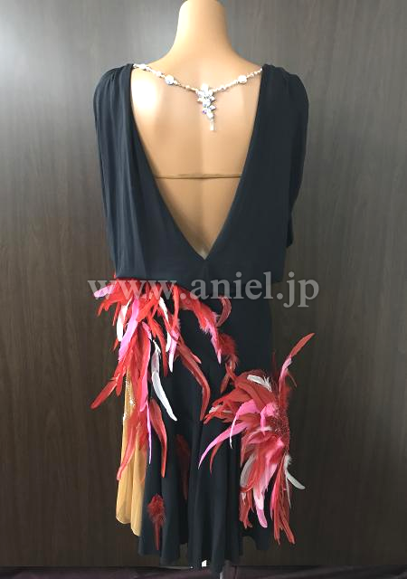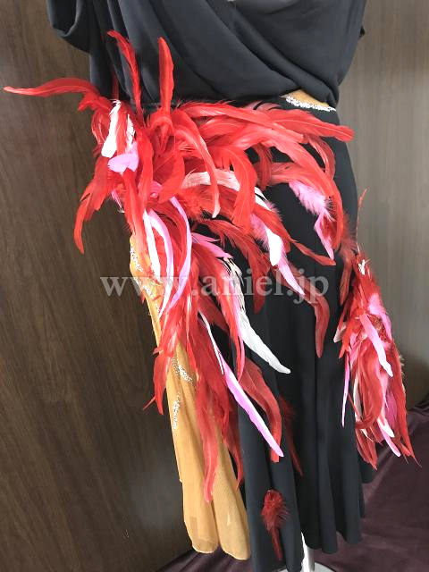 黒のドレープに赤、ピンク、白の羽根の装飾が華やかなドレスです。