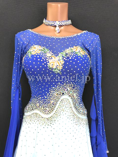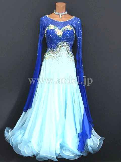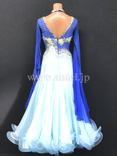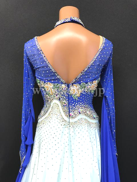 青のボディと水色のスカートが美しく、ウエストから広がるスカートが舞います。