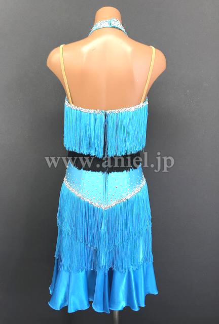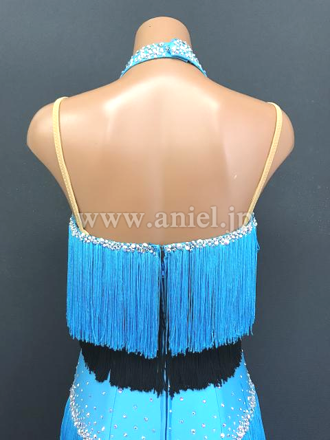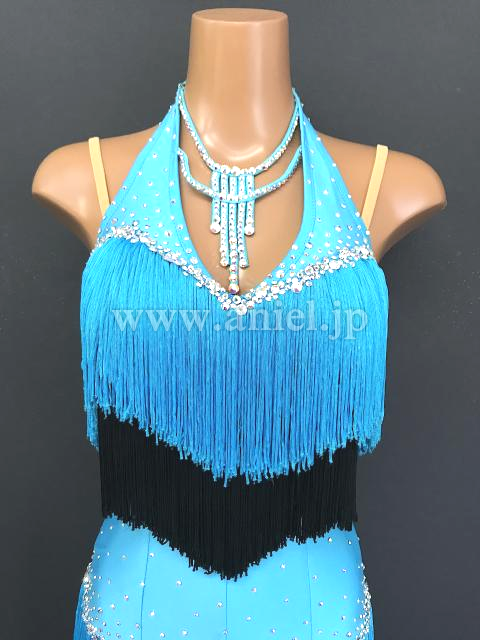 胸元は水色と黒のフリンジが段々になっています。