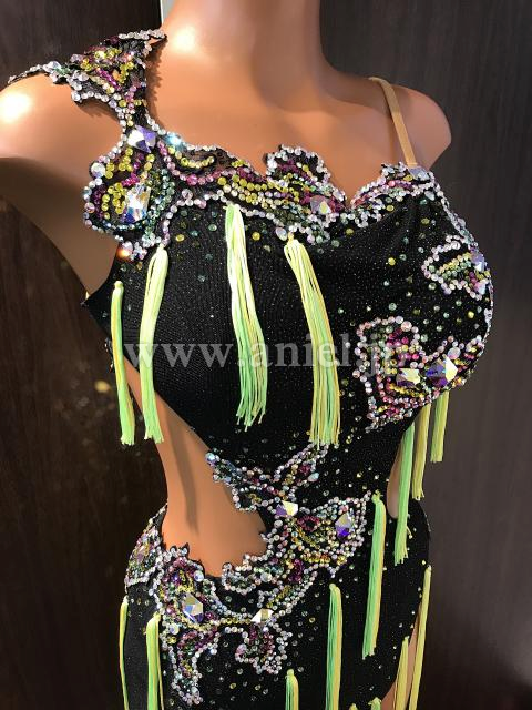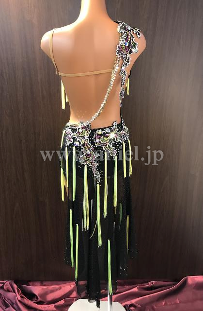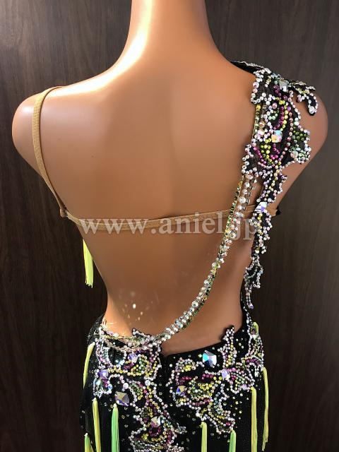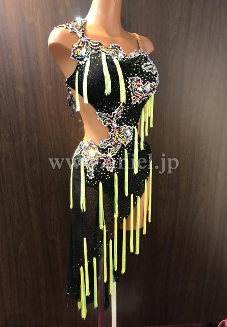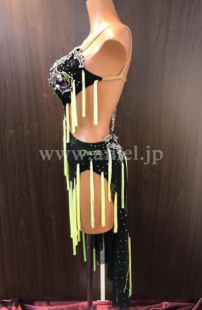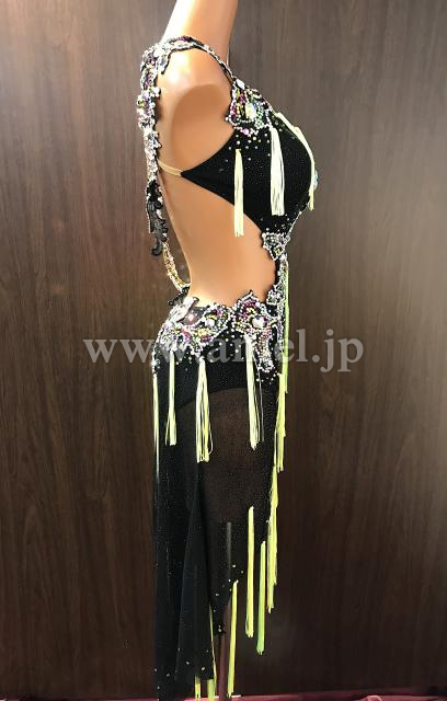 蛍光イエローのタッセルフリンジがよく踊るドレスです。