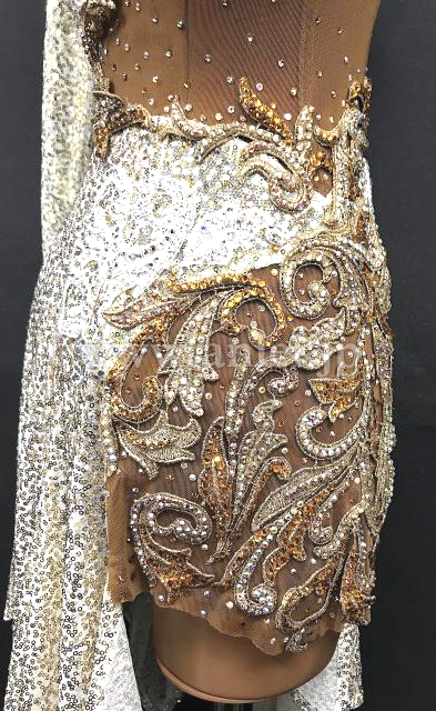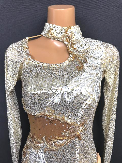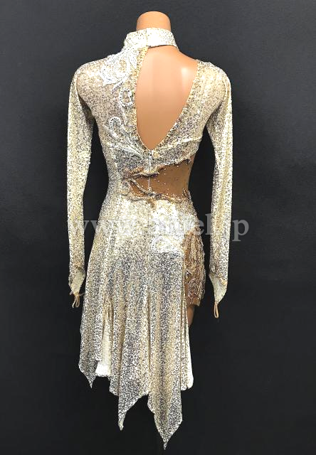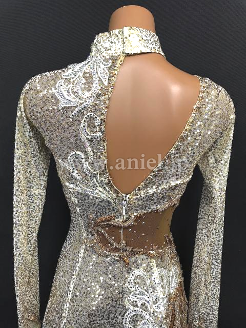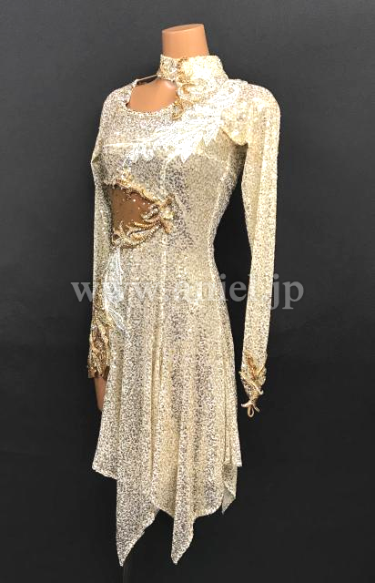 ゴールドのスパンコール生地が非常にきらびやかなドレスです。