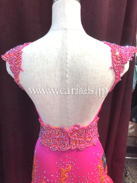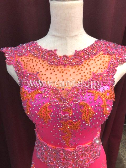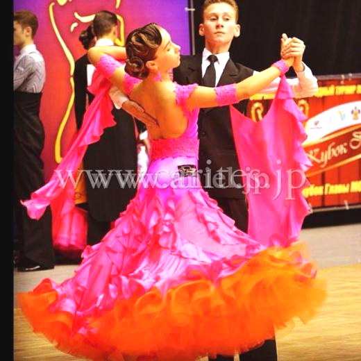 スカートはフリルを組み合わせてよく舞うスタイル。インナースカートにホースヘアーを使用したオレンジカラーを使い、フロア映えします。