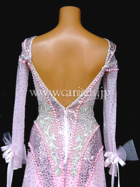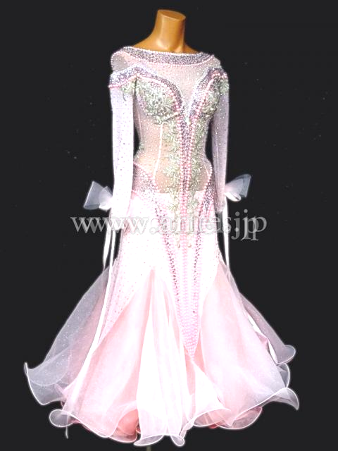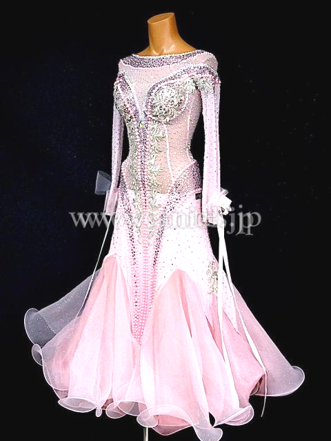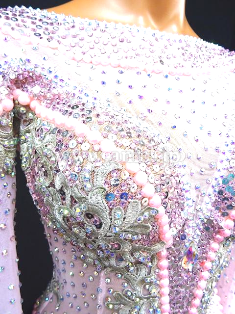 優しいベビーピンクのドレス。ロングスリーブのメッシュ生地の上にストーンを使用しています。
