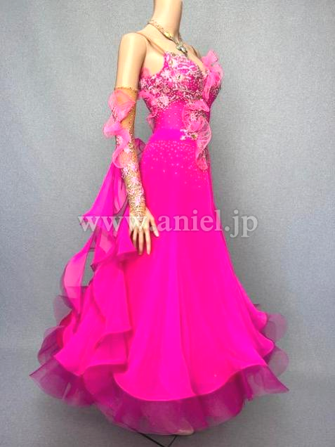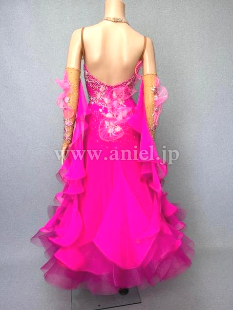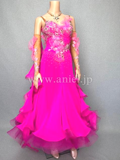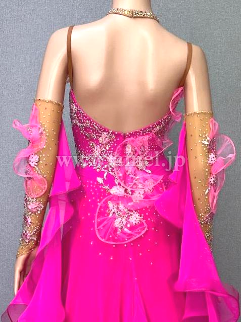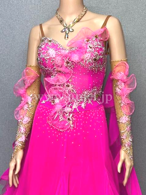 ボディ、グローブに取り付けられたフリル、フラワーモチーフが可愛いドレスです。