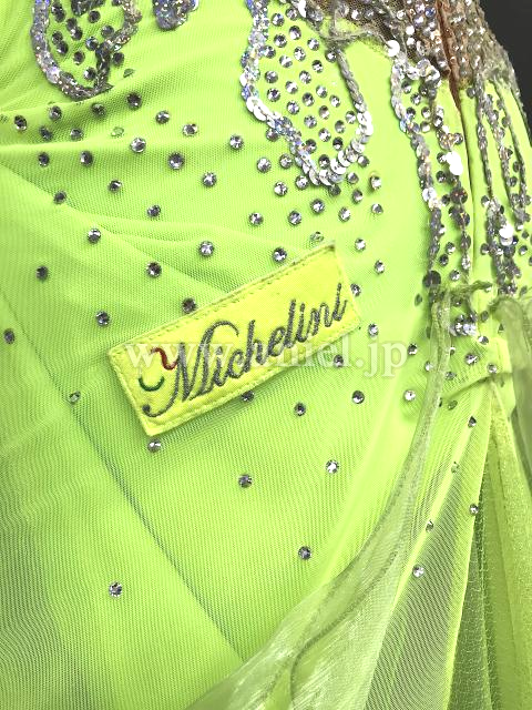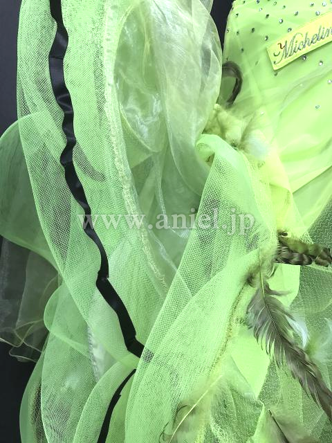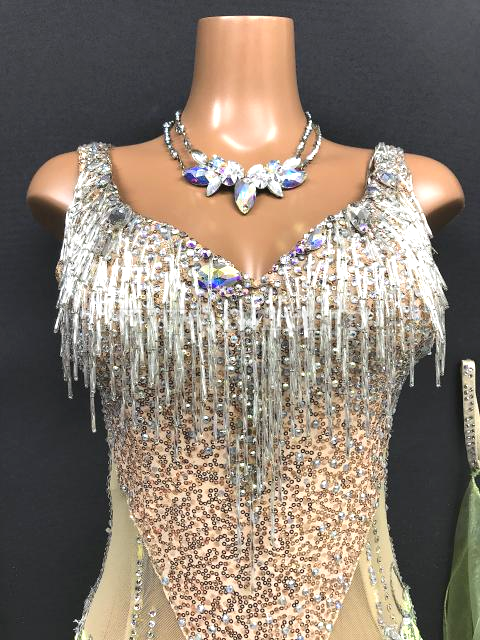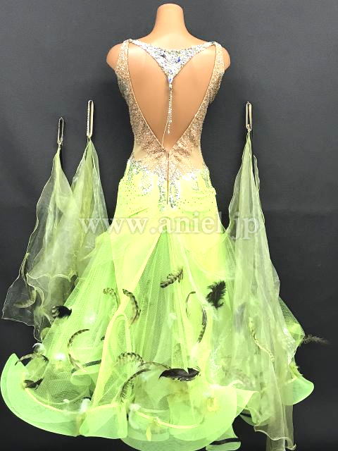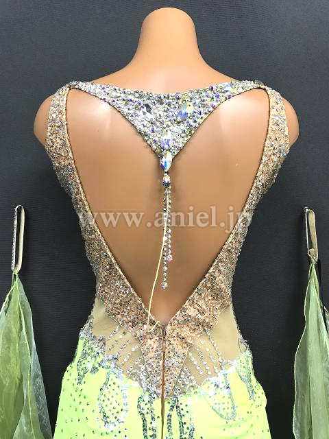 ベージュのスパンコール生地を使ったボディに黄緑のスカートが映えるドレスです。