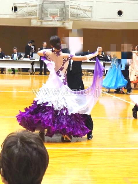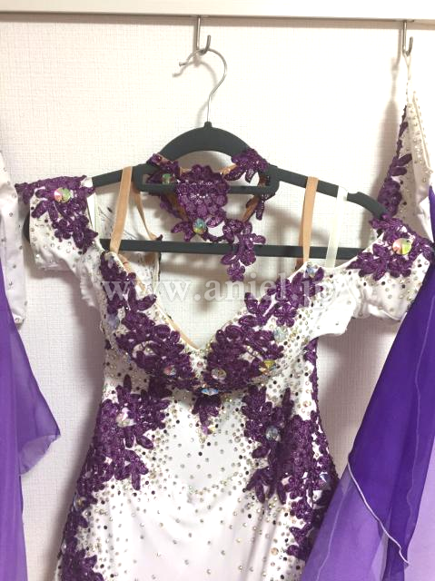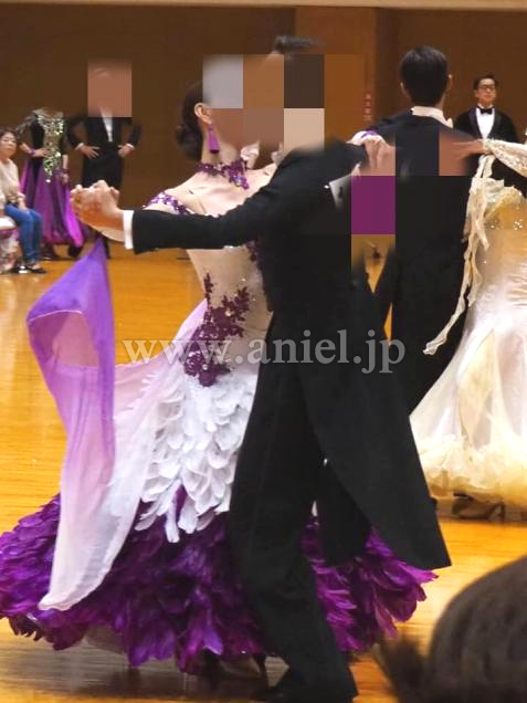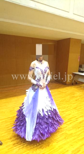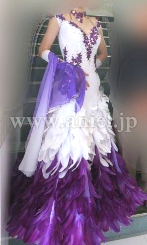 紫と白の羽がびっしりと裾に広がり、ターンやピクチャーでふわっと踊るので、とても華やかでフロアで目立ちます。チョーカーや胸元も紫のお花の刺繍が凝っており、ドレープが紫のグラデーションでとても綺麗です。中古美品を購入後、袖部分をよらピッタリ着用できるようプロのリフォーム屋さんにたのんで、ベージュのバンドをつけました。いらなければ取れると思います。