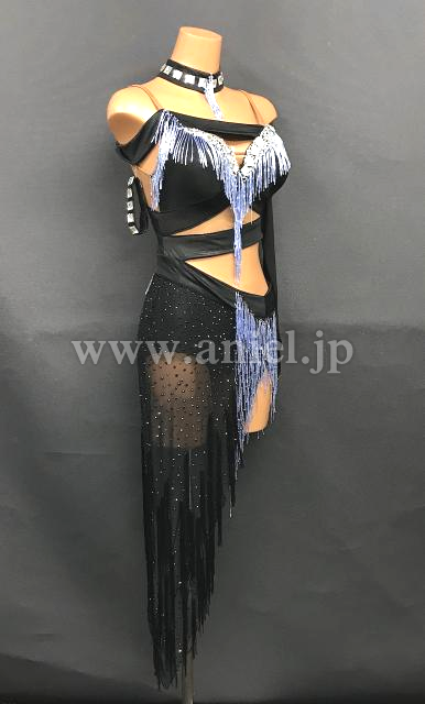 黒とペールブルーのビーズフリンジを使用したドレス。