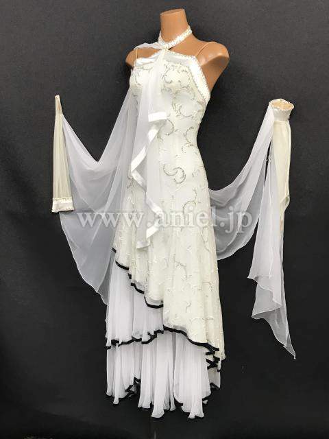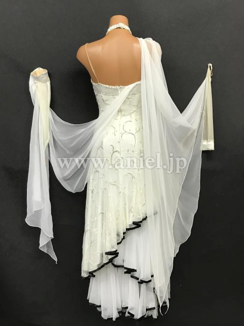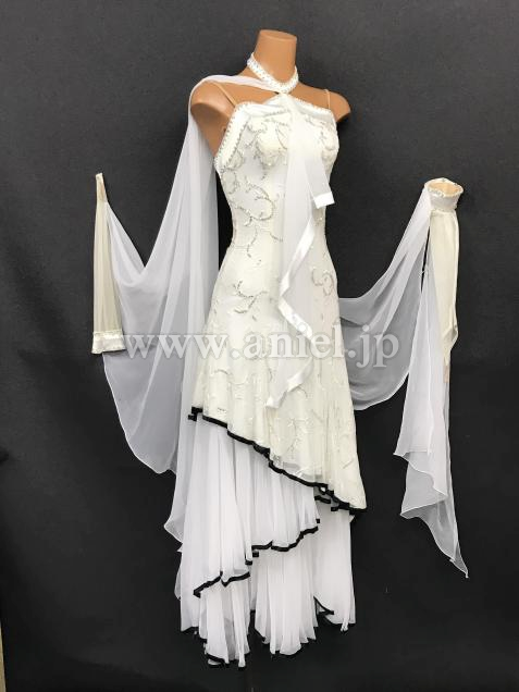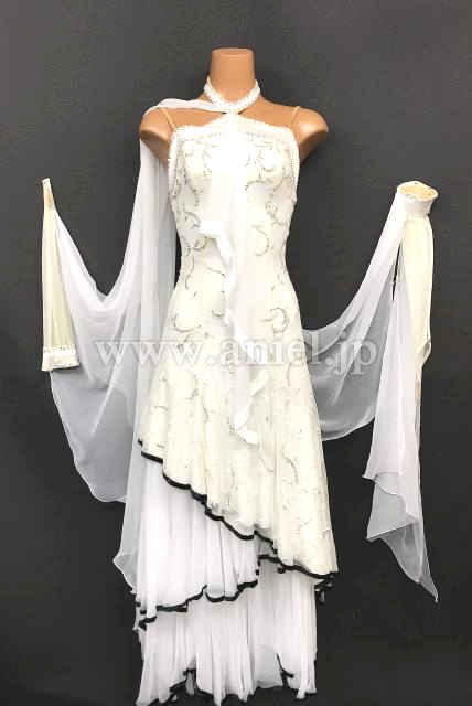 ティアードのIラインスカートに、首から繋がるフロートが広がるドレスです。
