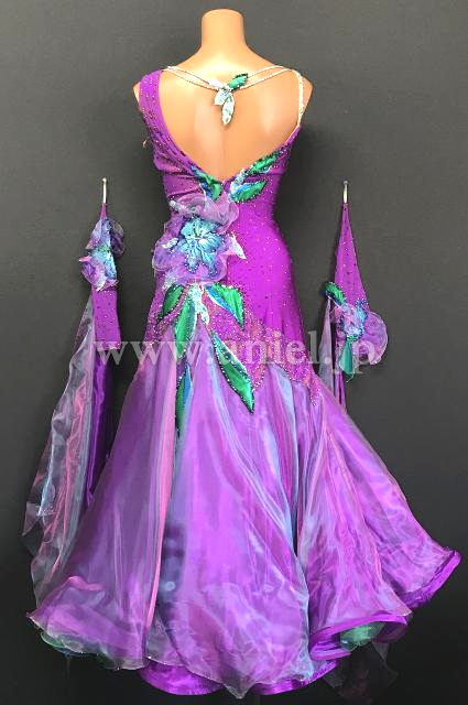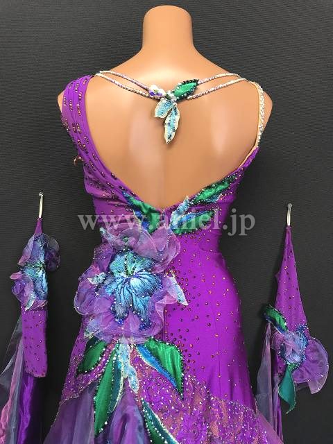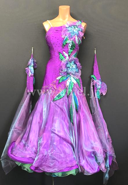 紫に美しい青のフラワーモチーフ、立体の装飾が華やかなドレスです。