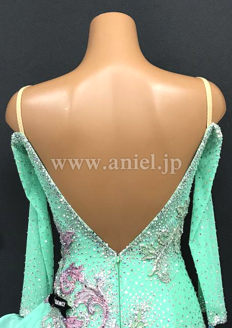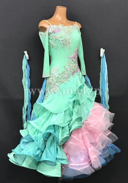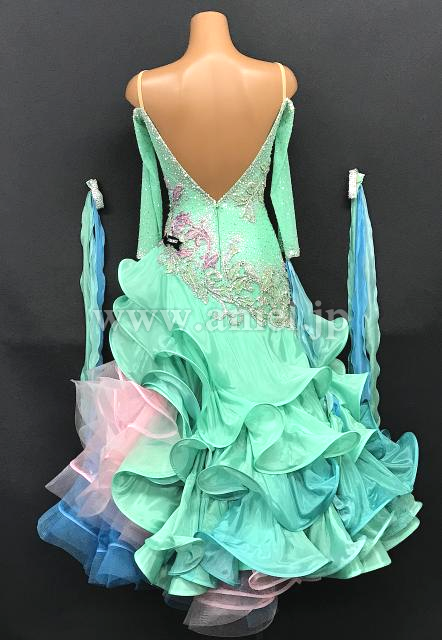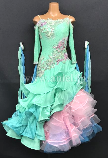 グリーンカラーに淡いピンク、青がアクセントとなって目立つドレスです。