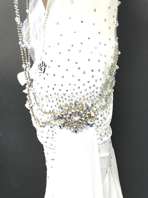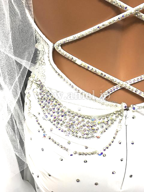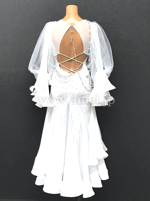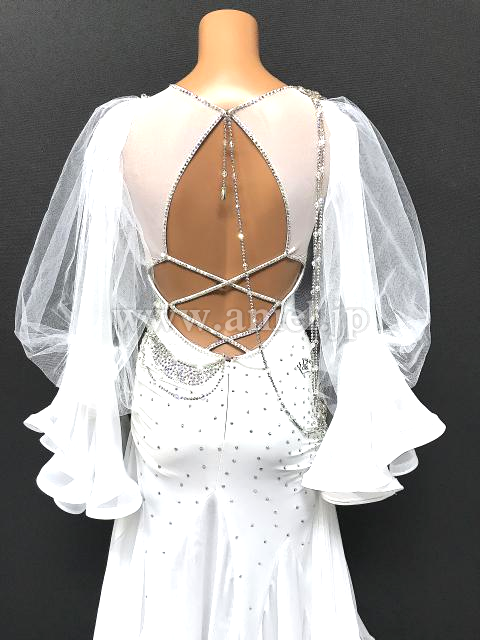 バックには、クロスデザインとストーンチェーンで露出を抑えています。