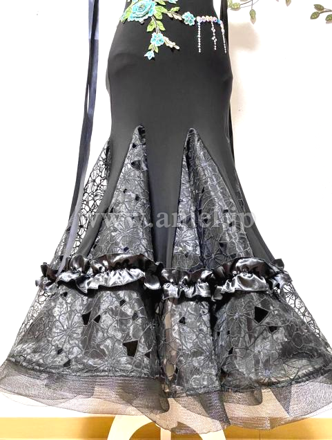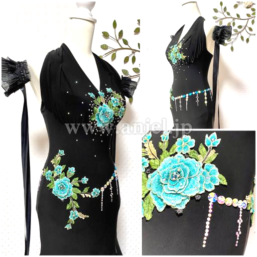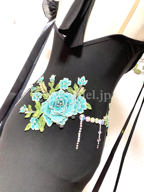 胸元とヒップ周りにグリーンのモチーフを縫い付け、グリーンとオーロラカラーのストーンを装飾