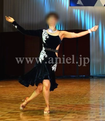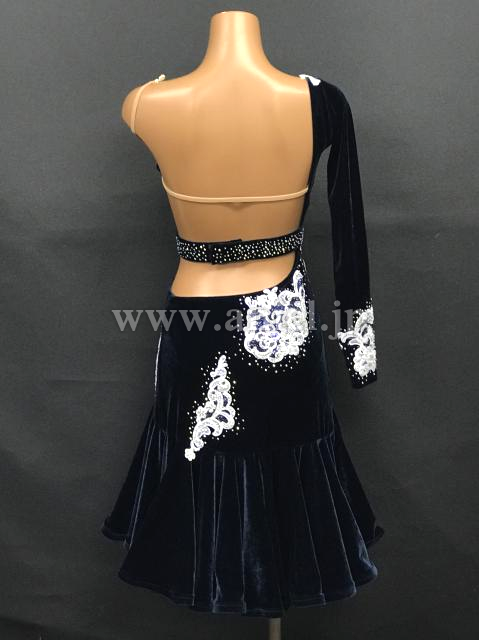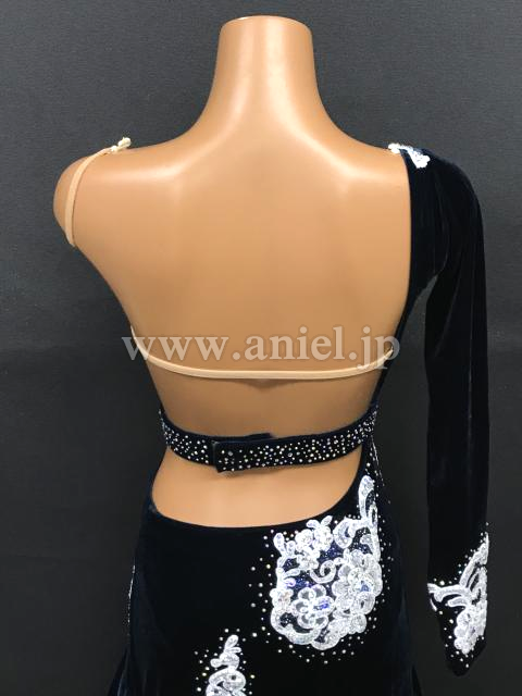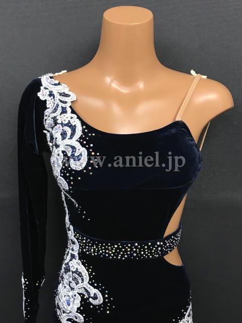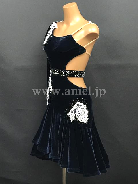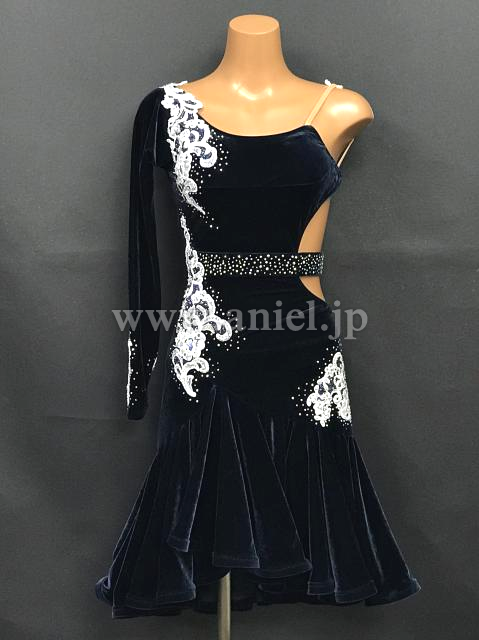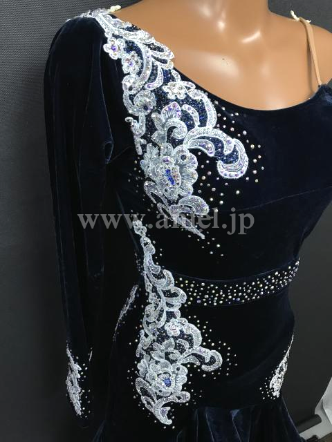 ネイビーベルベット生地のボディに白のモチーフレースが映えるドレスです。