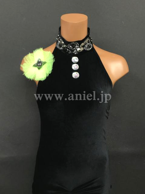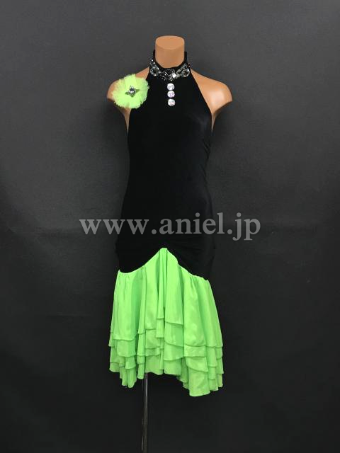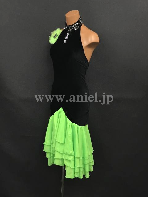 黒のベルベットボディに黄緑が映えるドレスです。