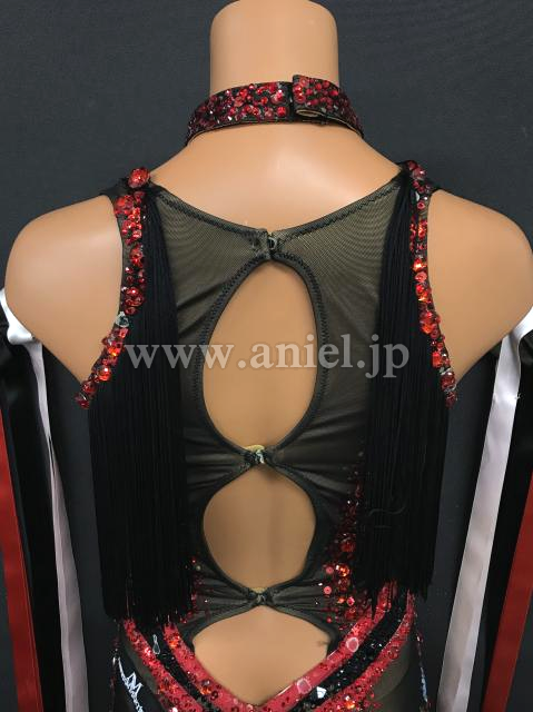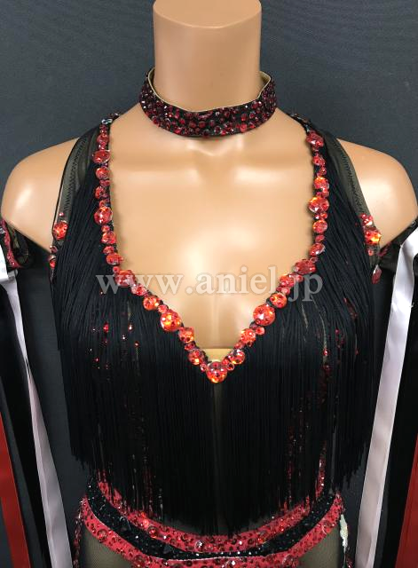 胸元から背中にはフリンジがあしらわれ動きがあります。