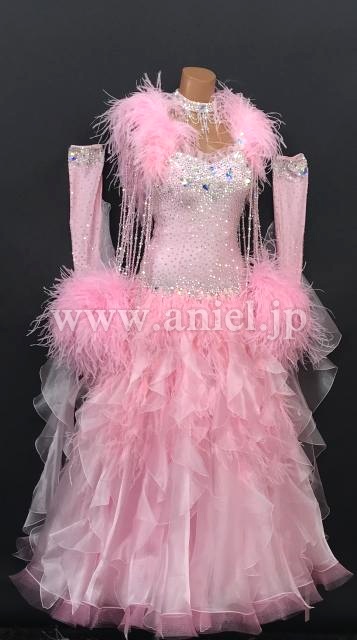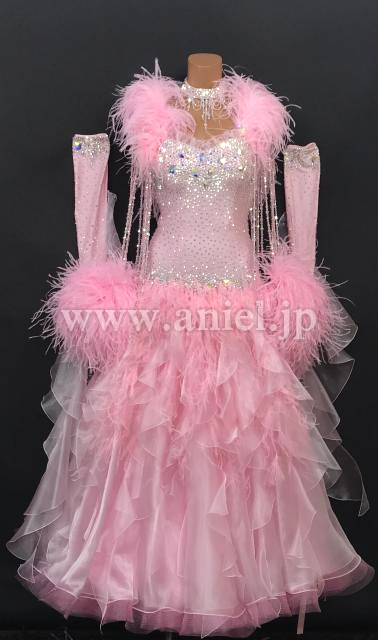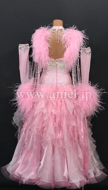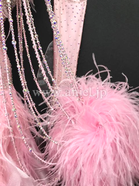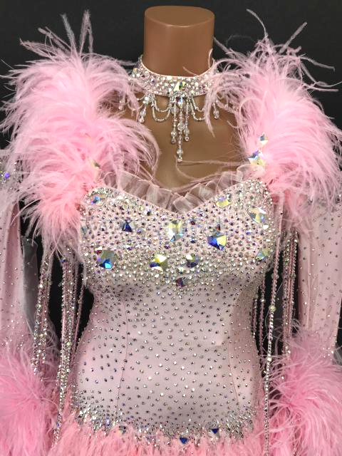 肩や手首に羽根がゴージャスに飾られたドレスです。