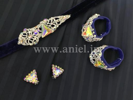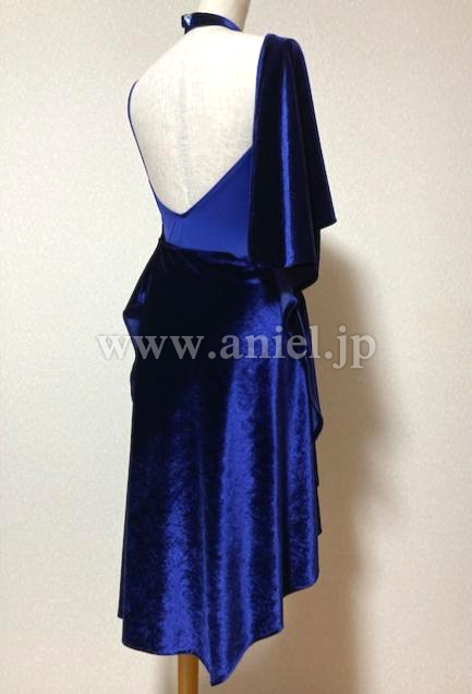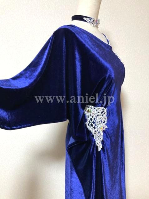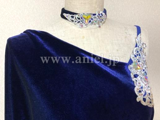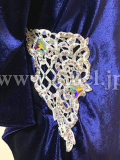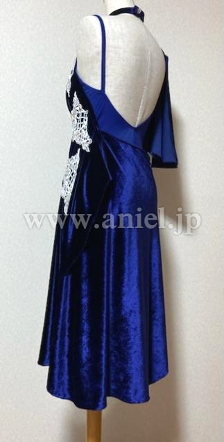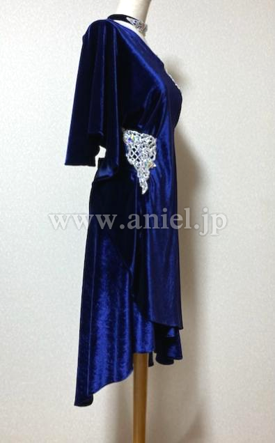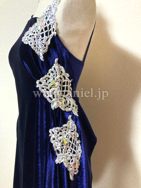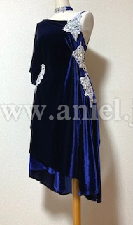ネイビー色の光沢のあるベロア生地&白モチーフのラテンドレスです。