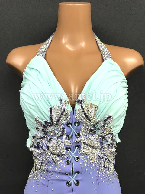 ペパーミントと紫の組み合わせがおしゃれなドレスです。