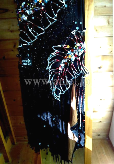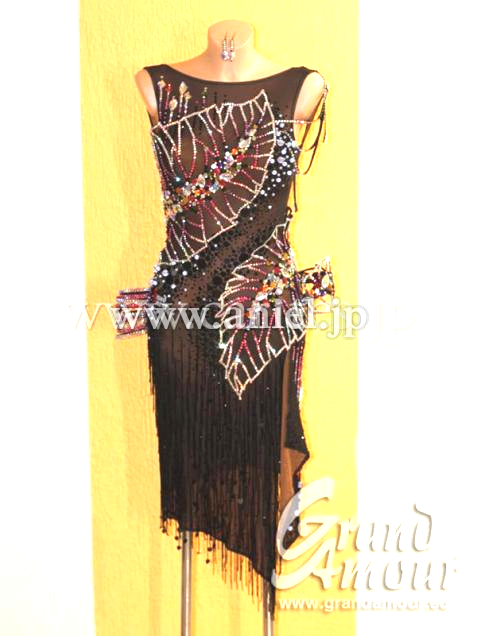 スポンサードレスでした。黒のシンプルラインにリ-フの3Dモチ-フが付いています。黒地ですがカラフルストーンが使われてフロアの遠目から見ても輝きます。膝丈であらゆる種目に対応します。