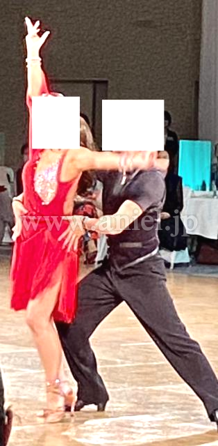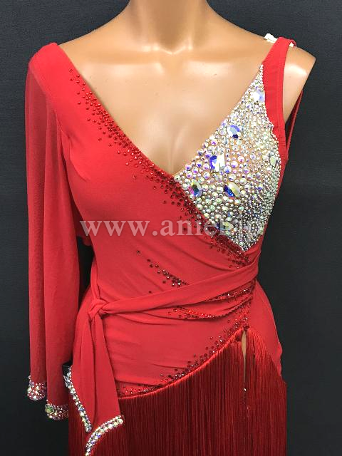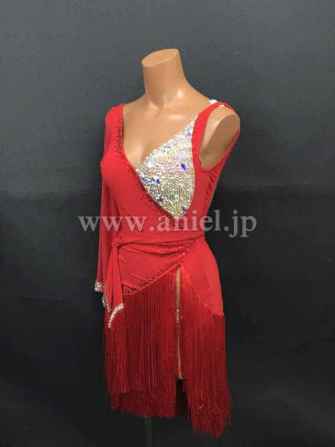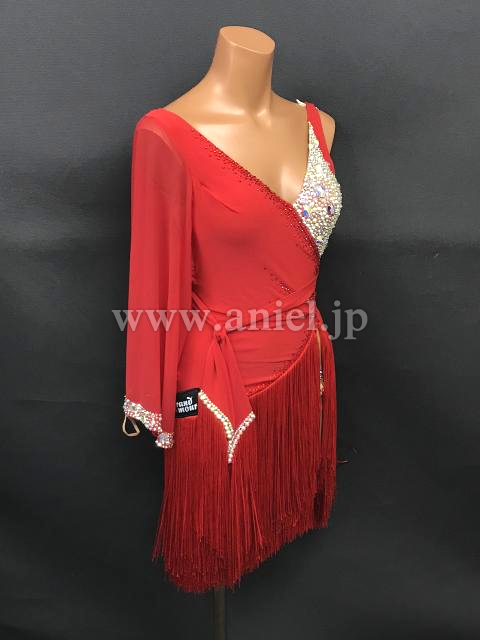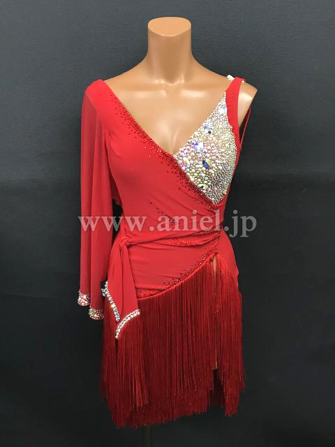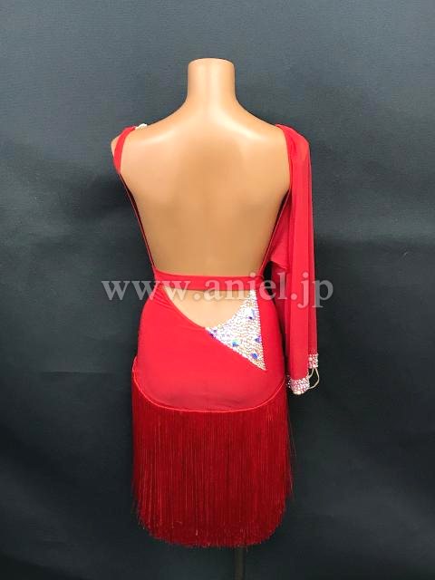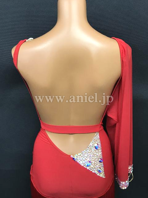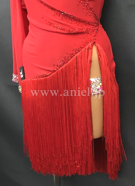 どこにいても目に入る発色のいい赤に、左の胸元と右腰部分にびっしりと貼られたオーロラの石。大ぶりの袖が左うでのみに付けられています。スカートはアシンメトリーのフリンジ。競技でもデモでも着ていただけます。