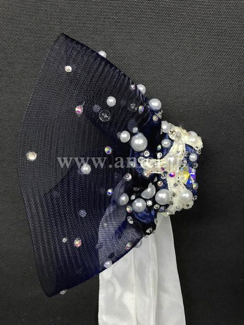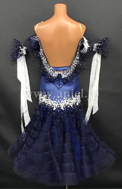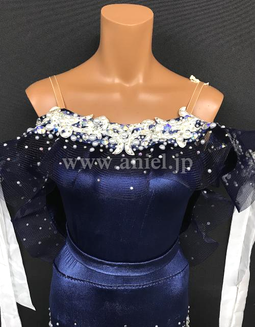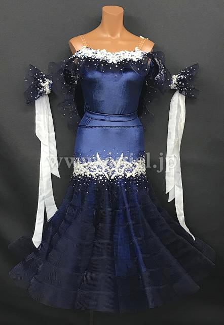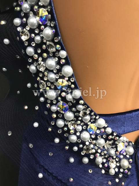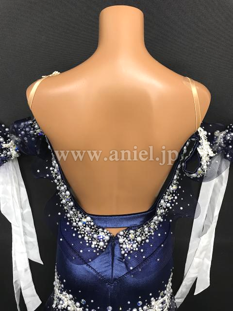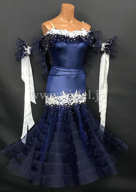 ネイビーカラーに白のモチーフやパールの装飾がとても映えるドレスです。