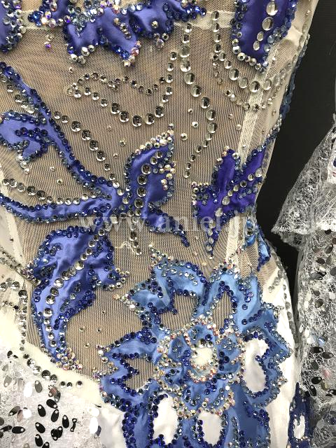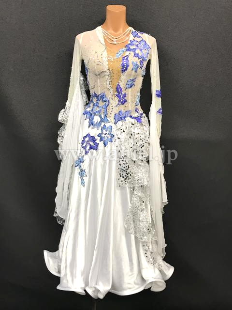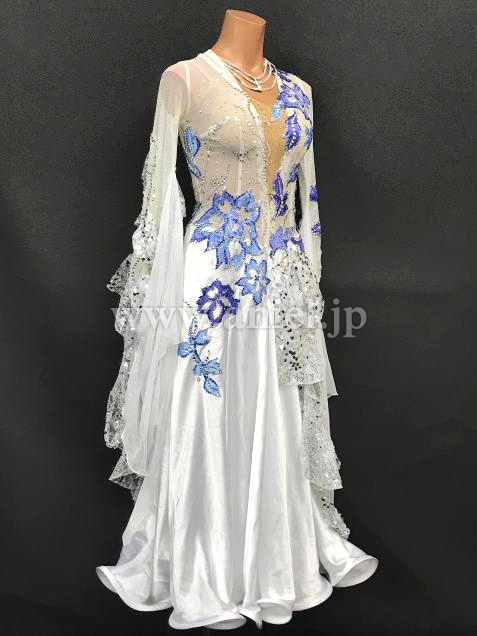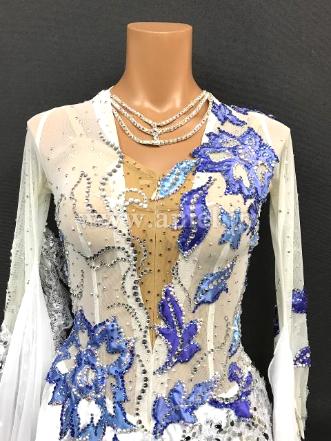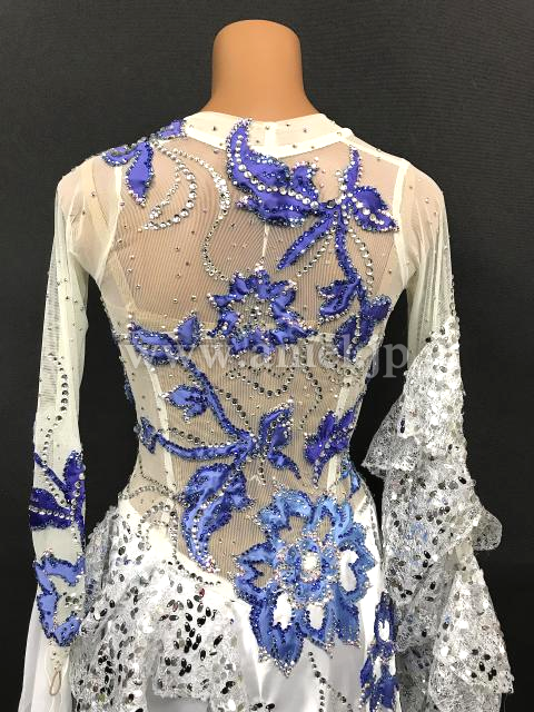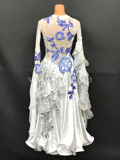 白シルバーのボディに大きな青のモチーフが豪華に飾られエレガントな雰囲気のドレスです。