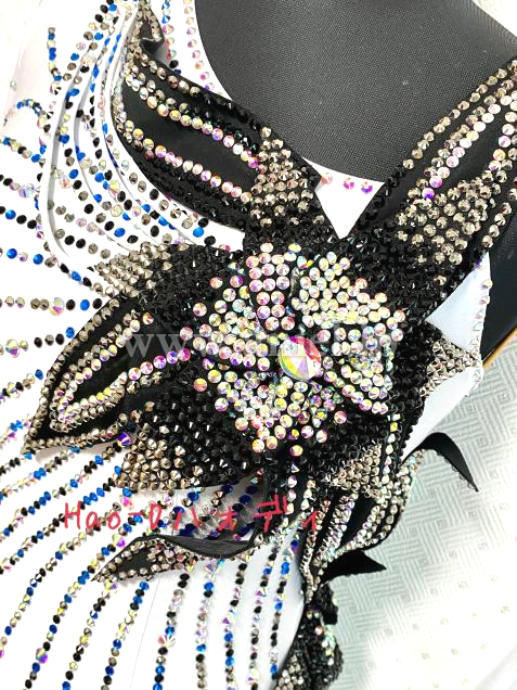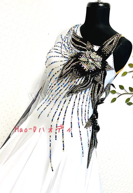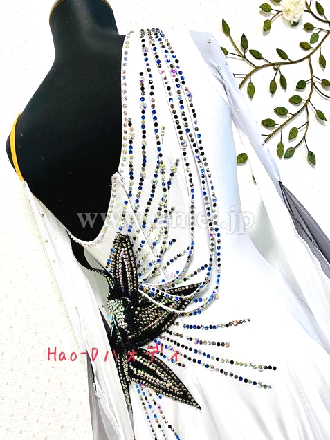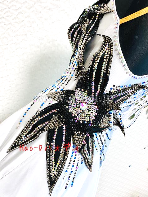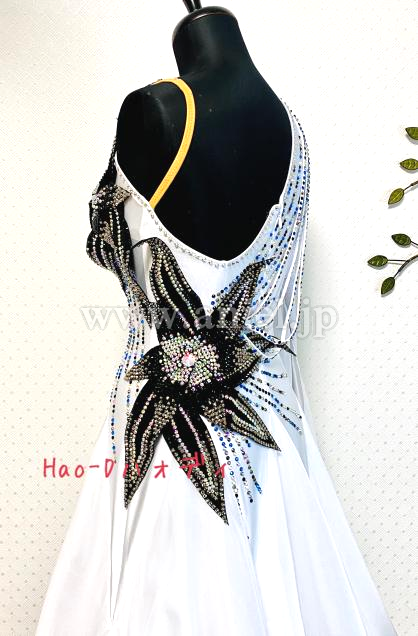 左側の胸元からヒップにかけて、大きな立体花モチーフを飾り、キラキラストーンを満遍なく貼り付けて大変豪華