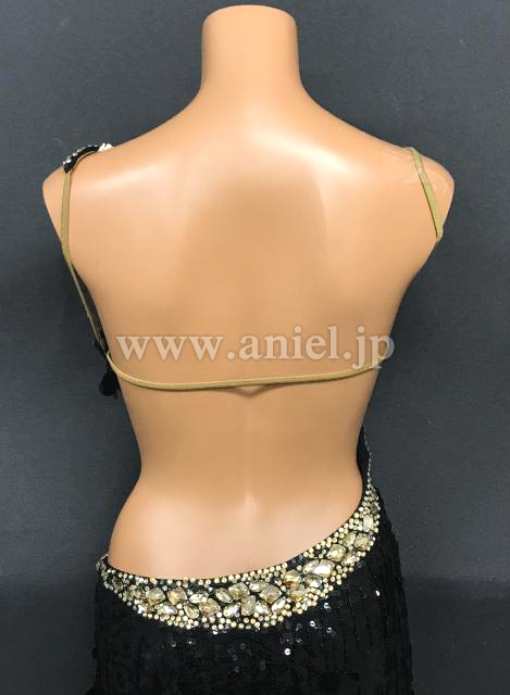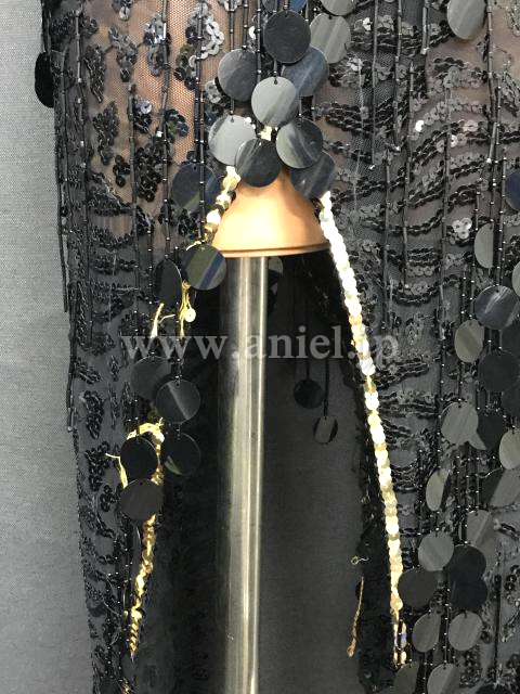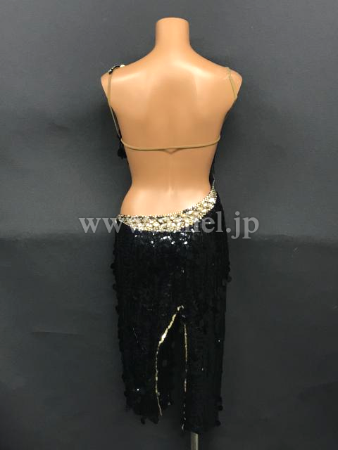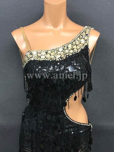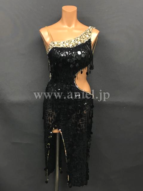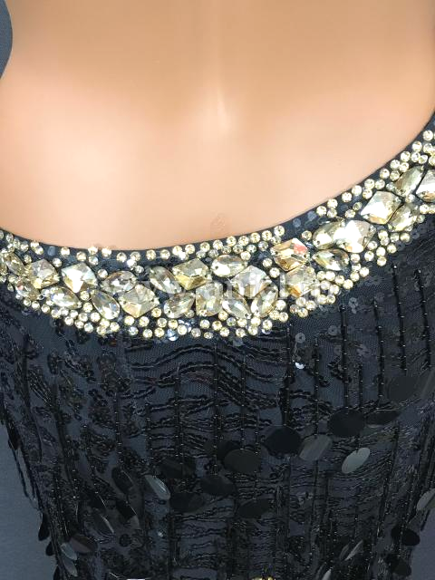 黒のスパンコール刺繍にスパンコールのフリンジが煌びやかなドレスです。