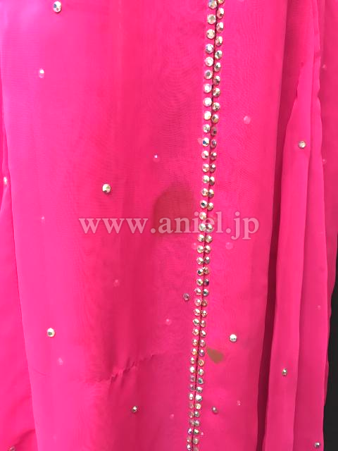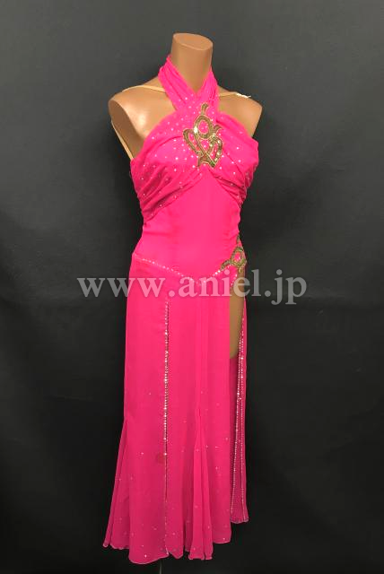 鮮やかなピンクのロングドレス。
