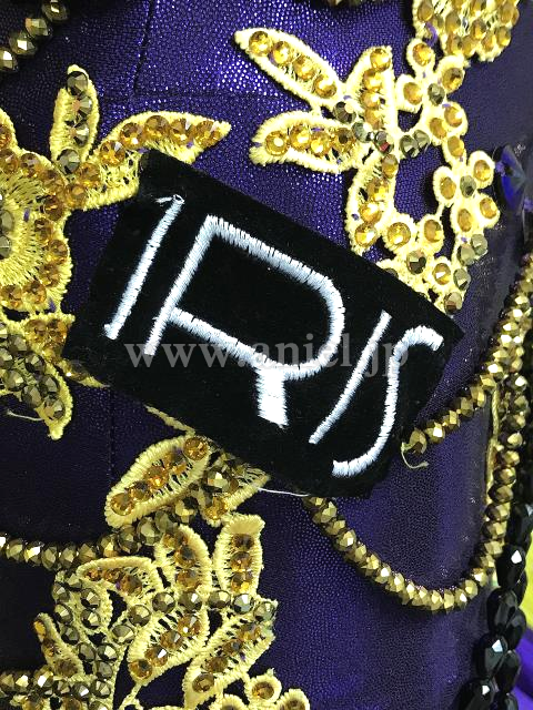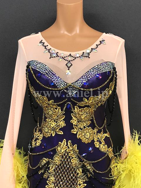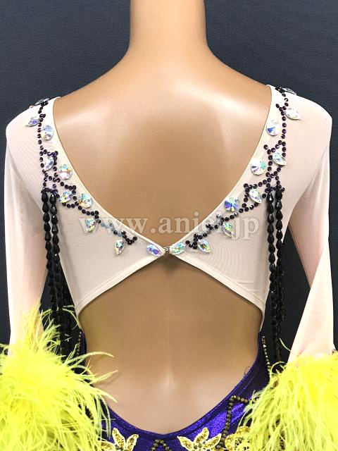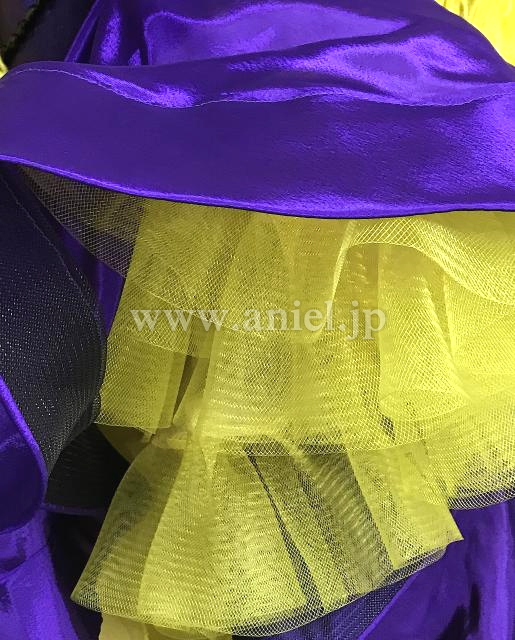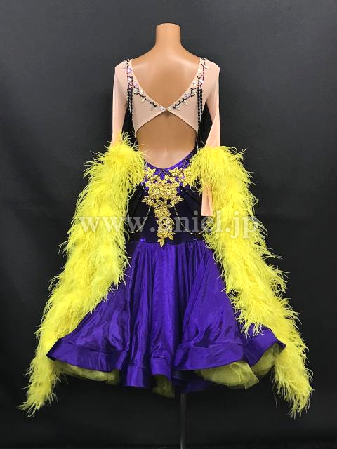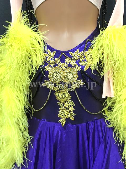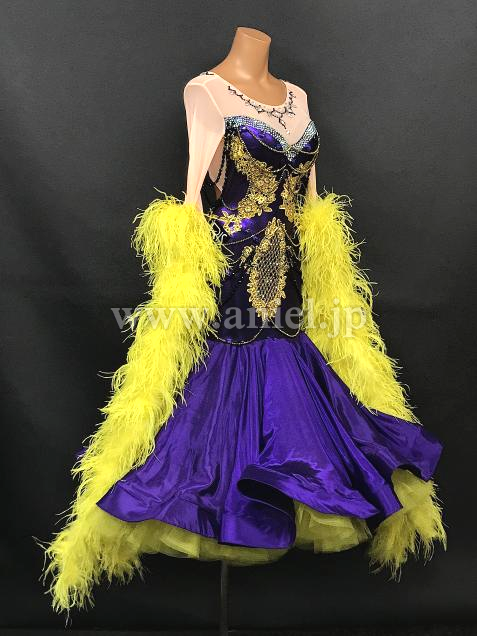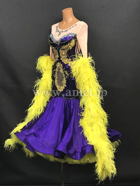 紫の高級感あるボディにゴールドのレース、ビーズチェーンが映えるドレスです。
